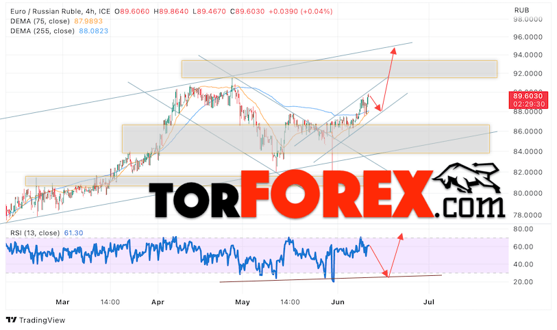 Дополнительным сигнальном в пользу подъёма валютной пары EUR/RUB на Форекс выступит тест линии линии поддержки на индикаторе относительной силы (RSI). Вторым сигналом станет отскок от нижней границы бычьего канала. Отменой варианта роста валютной пары EUR/RUB на Форекс 13 июня 2023 станет падение и пробой уровня 84.95 Евро за Рубль. Это укажет на пробой области поддержки и продолжение падения пары Евро Рубль в область ниже уровня 77.75. Подтверждением росту валютной пары выступит пробой области сопротивления и закрытие котировок инструмента выше уровня 91.05, что укажет на пробой верхней границы бычьего канала.