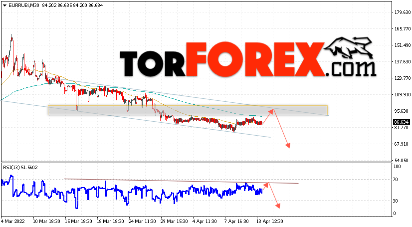 Дополнительным сигнальном в пользу падения валютной пары EUR/RUB на Форекс выступит тест линии сопротивления на индикаторе относительной силы (RSI). Вторым сигналом станет отскок от верхней границы нисходящего канала. Отменой варианта падения валютной пары EUR/RUB на Форекс 14 апреля 2022 станет сильный рост и пробой уровня 105.05 Евро за Рубль. Это укажет на пробой области сопротивления и продолжение роста пары Евро Рубль в область выше уровня 115.05. Подтверждением падению валютной пары выступит пробой области поддержки и закрытие котировок инструмента под уровнем 80.05.