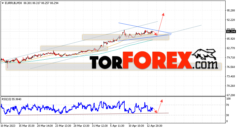 Дополнительным сигнальном в пользу подъёма валютной пары EUR/RUB на Форекс выступит тест линии линии поддержки на индикаторе относительной силы (RSI). Вторым сигналом станет отскок от нижней границы модели ”Треугольник”. Отменой варианта роста валютной пары EUR/RUB на Форекс 14 апреля 2023 станет падение и пробой уровня 83.25 Евро за Рубль. Это укажет на пробой области поддержки и продолжение снижения пары Евро Рубль в область ниже уровня 75.65. Подтверждением росту валютной пары выступит пробой области сопротивления и закрытие котировок инструмента выше уровня 91.55, что укажет на пробой верхней границы модели ”Треугольник” и начало отработки модели с целями вверху.