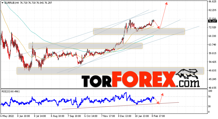 Дополнительным сигнальном в пользу подъёма валютной пары EUR/RUB на Форекс выступит тест линии линии поддержки на индикаторе относительной силы (RSI). Вторым сигналом станет отскок от нижней границы бычьего канала. Отменой варианта роста валютной пары EUR/RUB на Форекс 14 февраля 2023 станет падение и пробой уровня 68.45 Евро за Рубль. Это укажет на пробой области поддержки и продолжение снижения пары Евро Рубль в область ниже уровня 64.55. Подтверждением росту валютной пары выступит пробой области сопротивления и закрытие котировок инструмента выше уровня 78.75.