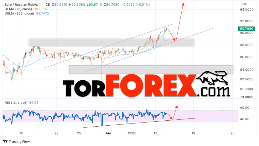 Дополнительным сигнальном в пользу подъёма валютной пары EUR/RUB на Форекс выступит тест линии линии поддержки на индикаторе относительной силы (RSI). Вторым сигналом станет отскок от нижней границы бычьего канала. Отменой варианта роста валютной пары EUR/RUB на Форекс 14 июня 2023 станет падение и пробой уровня 86.65 Евро за Рубль. Это укажет на пробой области поддержки и продолжение падения пары Евро Рубль в область ниже уровня 82.65. Подтверждением росту валютной пары выступит пробой области сопротивления и закрытие котировок инструмента выше уровня 92.35, что укажет на пробой верхней границы бычьего канала.