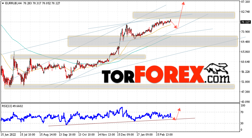 Дополнительным сигнальном в пользу подъёма валютной пары EUR/RUB на Форекс выступит тест линии линии поддержки на индикаторе относительной силы (RSI). Вторым сигналом станет отскок от нижней границы бычьего канала. Отменой варианта роста валютной пары EUR/RUB на Форекс 14 марта 2023 станет падение и пробой уровня 72.05 Евро за Рубль. Это укажет на пробой области поддержки и продолжение снижения пары Евро Рубль в область ниже уровня 67.55. Подтверждением росту валютной пары выступит пробой области сопротивления и закрытие котировок инструмента выше уровня 81.05.