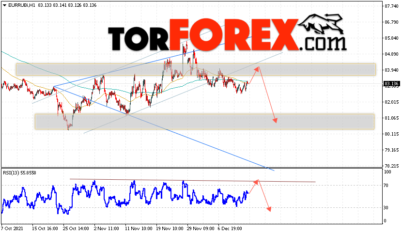 Дополнительным сигнальном в пользу снижения валютной пары EUR/RUB на Форекс выступит тест нисходящей линии тренда на индикаторе относительной силы (RSI). Вторым сигналом станет отскок от нижней границы бычьего канала. Отменой варианта падения валютной пары EUR/RUB на Форекс 15 декабря 2021 станет сильный рост и пробой уровня 85.45 Евро за Рубль. Это укажет на пробой области сопротивления и продолжение подъёма пары Евро Рубль в область выше уровня 87.85. Подтверждением падения валютной пары выступит пробой области поддержки и закрытие котировок инструмента под уровнем 82.05.