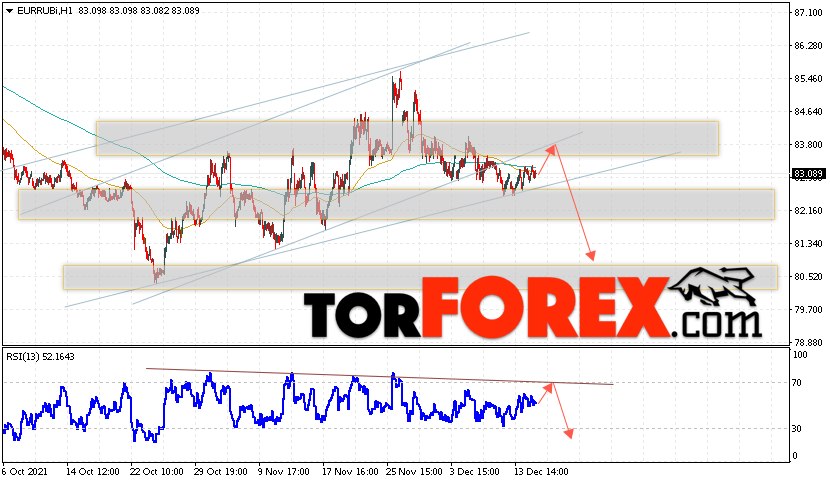 Дополнительным сигнальном в пользу снижения валютной пары EUR/RUB на Форекс выступит тест нисходящей линии тренда на индикаторе относительной силы (RSI). Вторым сигналом станет отскок от нижней границы бычьего канала, который был пробит вниз. Отменой варианта падения валютной пары EUR/RUB на Форекс 16 декабря 2021 станет сильный рост и пробой уровня 85.45 Евро за Рубль. Это укажет на пробой области сопротивления и продолжение подъёма пары Евро Рубль в область выше уровня 87.85. Подтверждением падения валютной пары выступит пробой области поддержки и закрытие котировок инструмента под уровнем 81.85.