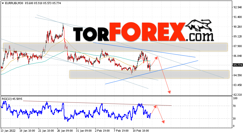 Дополнительным сигнальном в пользу падения валютной пары EUR/RUB на Форекс выступит тест линии тренда на индикаторе относительной силы (RSI). Вторым сигналом станет отскок от области сопротивления на графике цены и верхней границы нисходящего канала. Отменой варианта падения валютной пары EUR/RUB на Форекс 16 февраля 2022 станет сильный рост и пробой уровня 88.55 Евро за Рубль. Это укажет на пробой области сопротивления и продолжение роста пары Евро Рубль в область выше уровня 91.65. Подтверждением падению валютной пары выступит пробой области поддержки и закрытие котировок инструмента под уровнем 84.05, что укажет на пробой нижней границы модели ”Треугольник”.