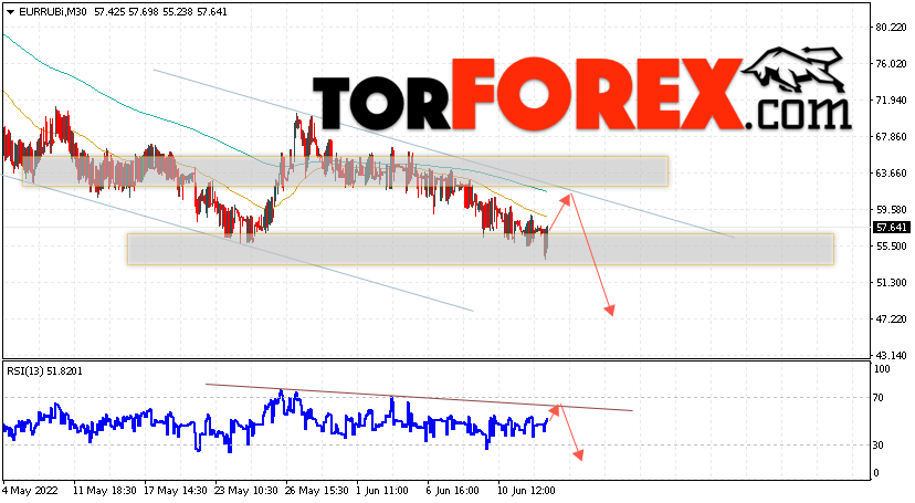 Дополнительным сигнальном в пользу падения валютной пары EUR/RUB на Форекс выступит тест линии линии сопротивления на индикаторе относительной силы (RSI). Вторым сигналом станет отскок от верхней границы медвежьего канала. Отменой варианта падения валютной пары EUR/RUB на Форекс 16 июня 2022 станет сильный рост и пробой уровня 65.45 Евро за Рубль. Это укажет на пробой области сопротивления и продолжение подъёма пары Евро Рубль в область выше уровня 67.55. Подтверждением падению валютной пары выступит пробой области поддержки и закрытие котировок инструмента ниже уровня 51.45.