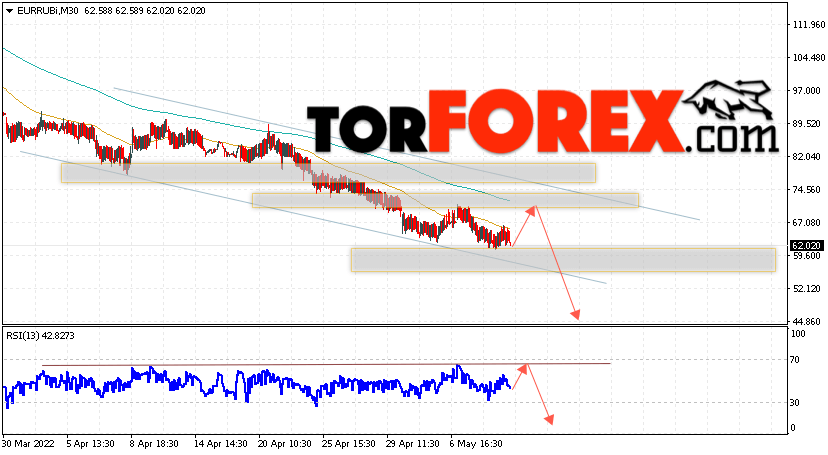 Дополнительным сигнальном в пользу падения валютной пары EUR/RUB на Форекс выступит тест линии сопротивления на индикаторе относительной силы (RSI). Вторым сигналом станет отскок от верхней границы медвежьего канала. Отменой варианта падения валютной пары EUR/RUB на Форекс 16 мая 2022 станет сильный рост и пробой уровня 82.45 Евро за Рубль. Это укажет на пробой области сопротивления и продолжение роста пары Евро Рубль в область выше уровня 87.55. Подтверждением падению валютной пары выступит пробой области поддержки и закрытие котировок инструмента под уровнем 55.45.