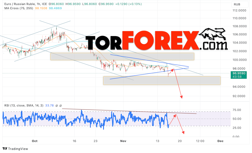 Дополнительным сигнальном в пользу падения валютной пары EUR/RUB на Форекс выступит тест линии линии сопротивления на индикаторе относительной силы (RSI). Вторым сигналом станет отскок от нижней границы модели «Треугольник». Отменой варианта падения валютной пары EUR/RUB на Форекс 16 ноября 2023 станет сильный рост и пробой уровня 101.65 Евро за Рубль. Это укажет на пробой области сопротивления и продолжение роста пары Евро Рубль в область выше уровня 105.65. Подтверждением падению валютной пары выступит пробой области поддержки и закрытие котировок инструмента ниже уровня 96.05.