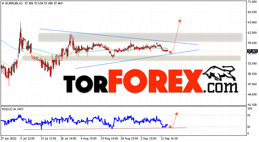 Дополнительным сигнальном в пользу роста валютной пары EUR/RUB на Форекс выступит тест линии линии поддержки на индикаторе относительной силы (RSI). Вторым сигналом станет отскок от нижней границы модели ”Треугольник”. Отменой варианта подъёма валютной пары EUR/RUB на Форекс 16 сентября 2022 станет падение и пробой уровня 53.35 Евро за Рубль. Это укажет на пробой области поддержки и продолжение падения пары Евро Рубль в область ниже уровня 48.05. Подтверждением росту валютной пары выступит пробой области сопротивления и закрытие котировок инструмента выше уровня 62.65, что укажет на пробой верхней границы модели ”Треугольник” и начало отработки паттерна.