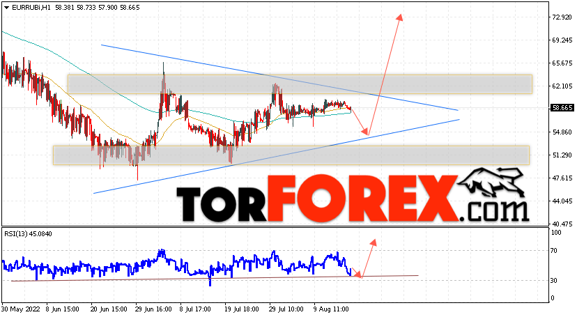 Дополнительным сигнальном в пользу роста валютной пары EUR/RUB на Форекс выступит тест линии линии поддержки на индикаторе относительной силы (RSI). Вторым сигналом станет отскок от нижней границы модели ”Треугольник”. Отменой варианта подъёма валютной пары EUR/RUB на Форекс 17 августа 2022 станет падение и пробой уровня 49.05 Евро за Рубль. Это укажет на пробой области поддержки и продолжение падения пары Евро Рубль в область ниже уровня 43.55. Подтверждением росту валютной пары выступит пробой области сопротивления и закрытие котировок инструмента выше уровня 65.05, что укажет на завершение формирования модели ”Треугольник” и начало отработки паттерна.