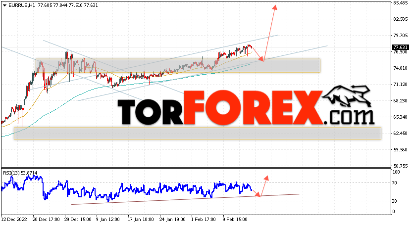 Дополнительным сигнальном в пользу подъёма валютной пары EUR/RUB на Форекс выступит тест линии линии поддержки на индикаторе относительной силы (RSI). Вторым сигналом станет отскок от нижней границы бычьего канала. Отменой варианта роста валютной пары EUR/RUB на Форекс 17 февраля 2023 станет падение и пробой уровня 73.05 Евро за Рубль. Это укажет на пробой области поддержки и продолжение снижения пары Евро Рубль в область ниже уровня 68.25. Подтверждением росту валютной пары выступит пробой области сопротивления и закрытие котировок инструмента выше уровня 80.25, что укажет на пробой верхней границы бычьего канала.