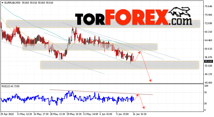 Дополнительным сигнальном в пользу падения валютной пары EUR/RUB на Форекс выступит тест линии линии сопротивления на индикаторе относительной силы (RSI). Вторым сигналом станет отскок от верхней границы медвежьего канала. Отменой варианта падения валютной пары EUR/RUB на Форекс 17 июня 2022 станет сильный рост и пробой уровня 65.05 Евро за Рубль. Это укажет на пробой области сопротивления и продолжение подъёма пары Евро Рубль в область выше уровня 68.05. Подтверждением падению валютной пары выступит пробой области поддержки и закрытие котировок инструмента ниже уровня 52.05.