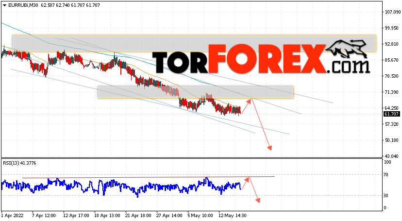 Дополнительным сигнальном в пользу падения валютной пары EUR/RUB на Форекс выступит тест линии сопротивления на индикаторе относительной силы (RSI). Вторым сигналом станет отскок от верхней границы медвежьего канала. Отменой варианта падения валютной пары EUR/RUB на Форекс 17 мая 2022 станет сильный рост и пробой уровня 78.05 Евро за Рубль. Это укажет на пробой области сопротивления и продолжение роста пары Евро Рубль в область выше уровня 85.05. Подтверждением падению валютной пары выступит пробой области поддержки и закрытие котировок инструмента под уровнем 55.85.