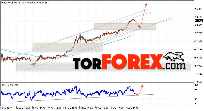 Дополнительным сигнальном в пользу подъёма валютной пары EUR/RUB на Форекс выступит тест линии линии поддержки на индикаторе относительной силы (RSI). Вторым сигналом станет отскок от нижней границы бычьего канала. Отменой варианта роста валютной пары EUR/RUB на Форекс 18 апреля 2023 станет падение и пробой уровня 78.45 Евро за Рубль. Это укажет на пробой области поддержки и продолжение снижения пары Евро Рубль в область ниже уровня 74.25. Подтверждением росту валютной пары выступит пробой области сопротивления и закрытие котировок инструмента выше уровня 91.05.