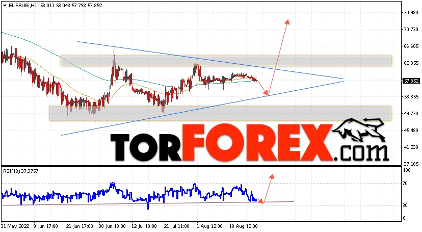 Дополнительным сигнальном в пользу роста валютной пары EUR/RUB на Форекс выступит тест линии линии поддержки на индикаторе относительной силы (RSI). Вторым сигналом станет отскок от нижней границы модели ”Треугольник”. Отменой варианта подъёма валютной пары EUR/RUB на Форекс 18 августа 2022 станет падение и пробой уровня 48.55 Евро за Рубль. Это укажет на пробой области поддержки и продолжение падения пары Евро Рубль в область ниже уровня 44.65. Подтверждением росту валютной пары выступит пробой области сопротивления и закрытие котировок инструмента выше уровня 63.35, что укажет на завершение формирования модели ”Треугольник” и начало отработки паттерна.