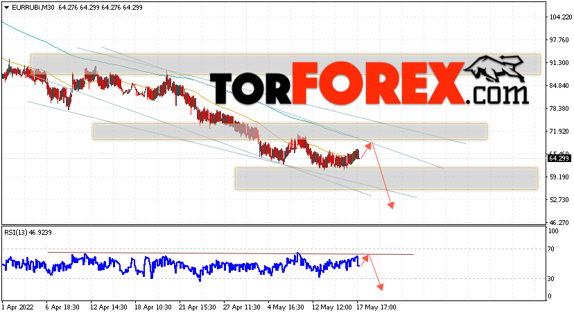 Дополнительным сигнальном в пользу падения валютной пары EUR/RUB на Форекс выступит тест линии сопротивления на индикаторе относительной силы (RSI). Вторым сигналом станет отскок от верхней границы медвежьего канала. Отменой варианта падения валютной пары EUR/RUB на Форекс 18 мая 2022 станет сильный рост и пробой уровня 73.35 Евро за Рубль. Это укажет на пробой области сопротивления и продолжение роста пары Евро Рубль в область выше уровня 80.05. Подтверждением падению валютной пары выступит пробой области поддержки и закрытие котировок инструмента под уровнем 58.95.