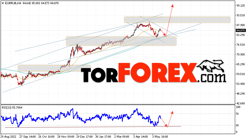 Дополнительным сигнальном в пользу роста валютной пары EUR/RUB на Форекс выступит тест линии линии поддержки на индикаторе относительной силы (RSI). Вторым сигналом станет отскок от верхней границы нисходящего канала. Отменой варианта подъёма валютной пары EUR/RUB на Форекс 18 мая 2023 станет падение и пробой уровня 79.05 Евро за Рубль. Это укажет на пробой области поддержки и продолжение падения пары Евро Рубль в область ниже уровня 75.65. Подтверждением росту валютной пары выступит пробой области сопротивления и закрытие котировок инструмента выше уровня 88.65, что укажет на пробой верхней границы нисходящего канала коррекции.