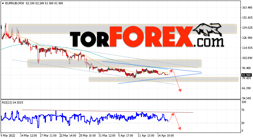 Дополнительным сигнальном в пользу падения валютной пары EUR/RUB на Форекс выступит тест линии сопротивления на индикаторе относительной силы (RSI). Вторым сигналом станет отскок от верхней границы модели ”Треугольник”. Отменой варианта падения валютной пары EUR/RUB на Форекс 19 апреля 2022 станет сильный рост и пробой уровня 100.05 Евро за Рубль. Это укажет на пробой области сопротивления и продолжение роста пары Евро Рубль в область выше уровня 110.05. Подтверждением падению валютной пары выступит пробой области поддержки и закрытие котировок инструмента под уровнем 77.05, что укажет на пробой нижней границы модели ”Треугольник”.