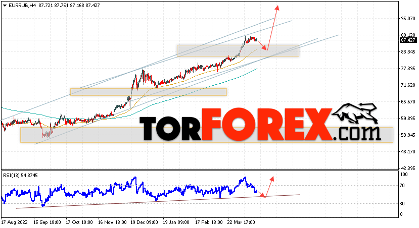 Дополнительным сигнальном в пользу подъёма валютной пары EUR/RUB на Форекс выступит тест линии линии поддержки на индикаторе относительной силы (RSI). Вторым сигналом станет отскок от нижней границы бычьего канала. Отменой варианта роста валютной пары EUR/RUB на Форекс 19 апреля 2023 станет падение и пробой уровня 78.45 Евро за Рубль. Это укажет на пробой области поддержки и продолжение снижения пары Евро Рубль в область ниже уровня 75.05. Подтверждением росту валютной пары выступит пробой области сопротивления и закрытие котировок инструмента выше уровня 91.05.