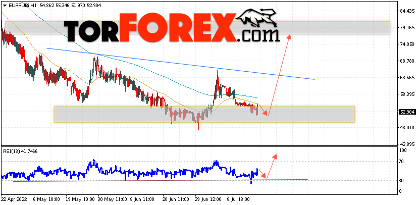 Дополнительным сигнальном в пользу роста валютной пары EUR/RUB на Форекс выступит тест линии линии поддержки на индикаторе относительной силы (RSI). Вторым сигналом станет отскок от нижней границы разворотной модели ”Голова и плечи”. Отменой варианта подъёма валютной пары EUR/RUB на Форекс 19 июля 2022 станет падение и пробой уровня 46.55 Евро за Рубль. Это укажет на пробой области поддержки и продолжение падения пары Евро Рубль в область ниже уровня 40.05. Подтверждением росту валютной пары выступит пробой области сопротивления и закрытие котировок инструмента выше уровня 66.45, что укажет на завершение формирования разворотной модели ”Голова и плечи” и начало отработки паттерна.