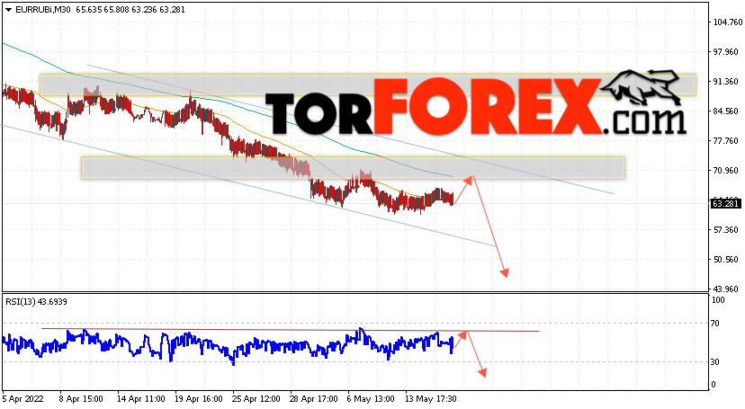 Дополнительным сигнальном в пользу падения валютной пары EUR/RUB на Форекс выступит тест линии сопротивления на индикаторе относительной силы (RSI). Вторым сигналом станет отскок от верхней границы медвежьего канала. Отменой варианта падения валютной пары EUR/RUB на Форекс 19 мая 2022 станет сильный рост и пробой уровня 75.55 Евро за Рубль. Это укажет на пробой области сопротивления и продолжение роста пары Евро Рубль в область выше уровня 80.05. Подтверждением падению валютной пары выступит пробой области поддержки и закрытие котировок инструмента под уровнем 58.75.