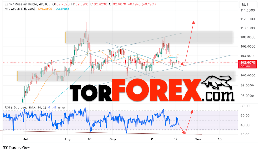 Дополнительным сигнальном в пользу роста валютной пары EUR/RUB на Форекс выступит тест линии линии поддержки на индикаторе относительной силы (RSI). Вторым сигналом станет отскок от нижней границы бычьего канала. Отменой варианта роста валютной пары EUR/RUB на Форекс 19 октября 2023 станет падение и пробой уровня 99.65 Евро за Рубль. Это укажет на пробой области поддержки и продолжение падения пары Евро Рубль в область ниже уровня 95.05. Подтверждением росту валютной пары выступит пробой области сопротивления и закрытие котировок инструмента выше уровня 106.05.