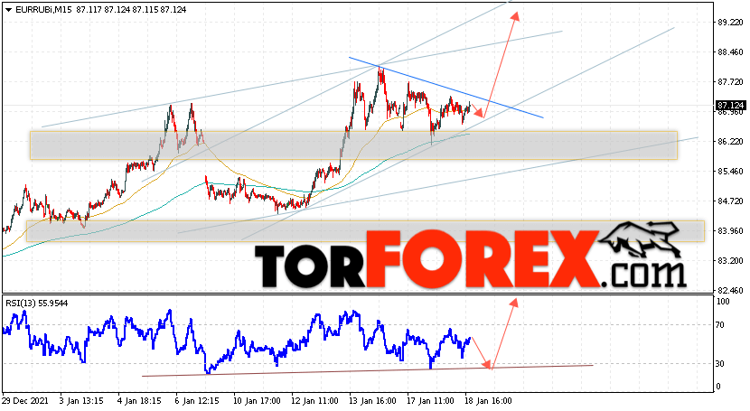 Дополнительным сигнальном в пользу подъёма валютной пары EUR/RUB на Форекс выступит тест линии тренда на индикаторе относительной силы (RSI). Вторым сигналом станет отскок от нижней границы бычьего канала. Отменой варианта роста валютной пары EUR/RUB на Форекс 19 января 2022 станет падение и пробой уровня 85.95 Евро за Рубль. Это укажет на пробой области поддержки и продолжение падения пары Евро Рубль в область ниже уровня 84.35. Подтверждением подъёма валютной пары выступит пробой области сопротивления и закрытие котировок инструмента над уровнем 88.05, что укажет на пробой верхней границы разворотной модели ”Голова и плечи”.