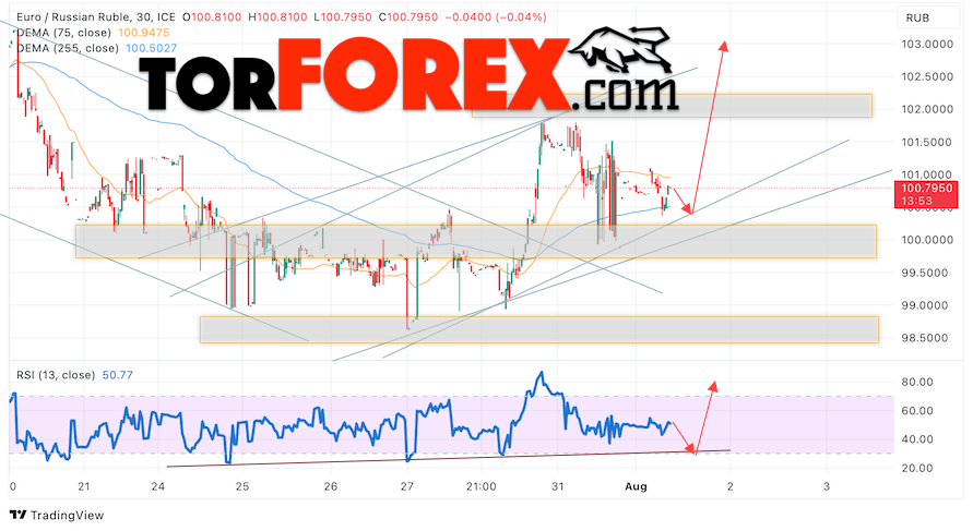 Дополнительным сигнальном в пользу подъёма валютной пары EUR/RUB на Форекс выступит тест линии линии поддержки на индикаторе относительной силы (RSI). Вторым сигналом станет отскок от нижней границы бычьего канала. Отменой варианта роста валютной пары EUR/RUB на Форекс 2 августа 2023 станет падение и пробой уровня 98.25 Евро за Рубль. Это укажет на пробой области поддержки и продолжение падения пары Евро Рубль в область ниже уровня 93.65. Подтверждением росту валютной пары выступит пробой области сопротивления и закрытие котировок инструмента выше уровня 102.05.
