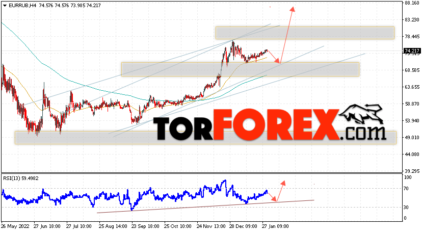 Дополнительным сигнальном в пользу подъёма валютной пары EUR/RUB на Форекс выступит тест линии линии поддержки на индикаторе относительной силы (RSI). Вторым сигналом станет отскок от верхней границы нисходящего канала. Отменой варианта роста валютной пары EUR/RUB на Форекс 2 февраля 2023 станет падение и пробой уровня 67.35 Евро за Рубль. Это укажет на пробой области поддержки и продолжение снижения пары Евро Рубль в область ниже уровня 63.55. Подтверждением росту валютной пары выступит пробой области сопротивления и закрытие котировок инструмента выше уровня 78.05.