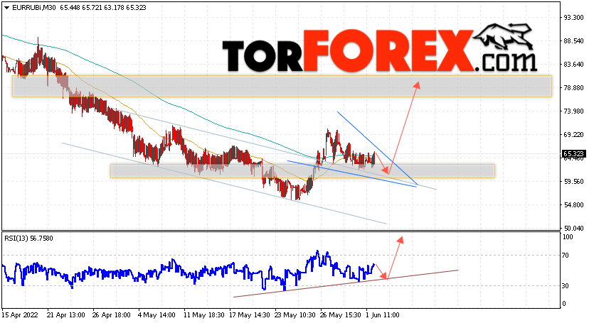 Дополнительным сигнальном в пользу роста валютной пары EUR/RUB на Форекс выступит тест линии линии поддержки на индикаторе относительной силы (RSI). Вторым сигналом станет отскок от верхней границы медвежьего канала, а также от модели ”Клин”. Отменой варианта подъёма валютной пары EUR/RUB на Форекс 2 июня 2022 станет падение и пробой уровня 54.05 Евро за Рубль. Это укажет на пробой области поддержки и продолжение падения пары Евро Рубль в область ниже уровня 47.55. Подтверждением подъёму валютной пары выступит пробой области сопротивления и закрытие котировок инструмента выше уровня 70.05, что укажет на пробой верхней границы модели ”Клин” и начало отработки этого паттерна.