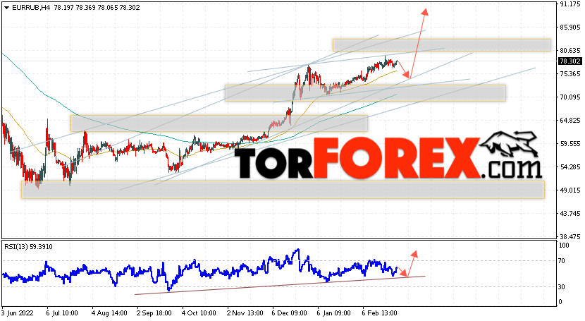 Дополнительным сигнальном в пользу подъёма валютной пары EUR/RUB на Форекс выступит тест линии линии поддержки на индикаторе относительной силы (RSI). Вторым сигналом станет отскок от нижней границы бычьего канала. Отменой варианта роста валютной пары EUR/RUB на Форекс 2 марта 2023 станет падение и пробой уровня 70.25 Евро за Рубль. Это укажет на пробой области поддержки и продолжение снижения пары Евро Рубль в область ниже уровня 66.85. Подтверждением росту валютной пары выступит пробой области сопротивления и закрытие котировок инструмента выше уровня 82.65, что укажет на пробой верхней границы бычьего канала, а это сигнал к росту на ширину канала.