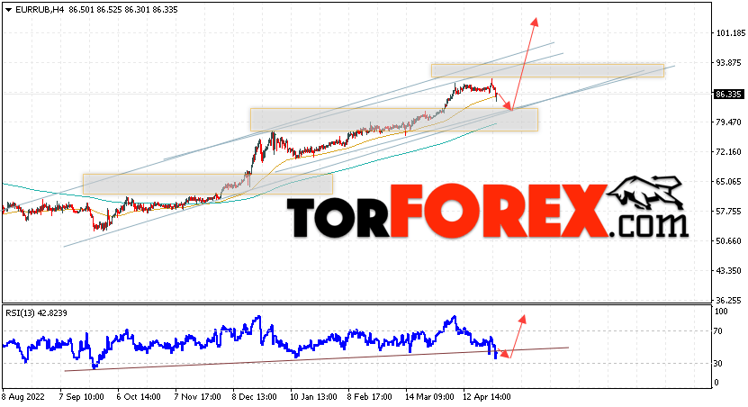 Дополнительным сигнальном в пользу подъёма валютной пары EUR/RUB на Форекс выступит тест линии линии поддержки на индикаторе относительной силы (RSI). Вторым сигналом станет отскок от нижней границы бычьего канала. Отменой варианта роста валютной пары EUR/RUB на Форекс 2 мая 2023 станет падение и пробой уровня 79.05 Евро за Рубль. Это укажет на пробой области поддержки и продолжение снижения пары Евро Рубль в область ниже уровня 70.05. Подтверждением росту валютной пары выступит пробой области сопротивления и закрытие котировок инструмента выше уровня 92.05