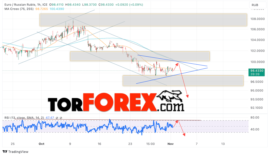Дополнительным сигнальном в пользу падения валютной пары EUR/RUB на Форекс выступит тест линии линии сопротивления на индикаторе относительной силы (RSI). Вторым сигналом станет отскок от верхней границы модели «Треугольник». Отменой варианта падения валютной пары EUR/RUB на Форекс 2 ноября 2023 станет сильный рост и пробой уровня 101.25 Евро за Рубль. Это укажет на пробой области поддержки и продолжение падения пары Евро Рубль в область выше уровня 103.85. Подтверждением падению валютной пары выступит пробой области поддержки и закрытие котировок инструмента ниже уровня 96.45, что укажет на пробой нижней границы модели «Треугольник» и начало отработки модели с целями внизу.