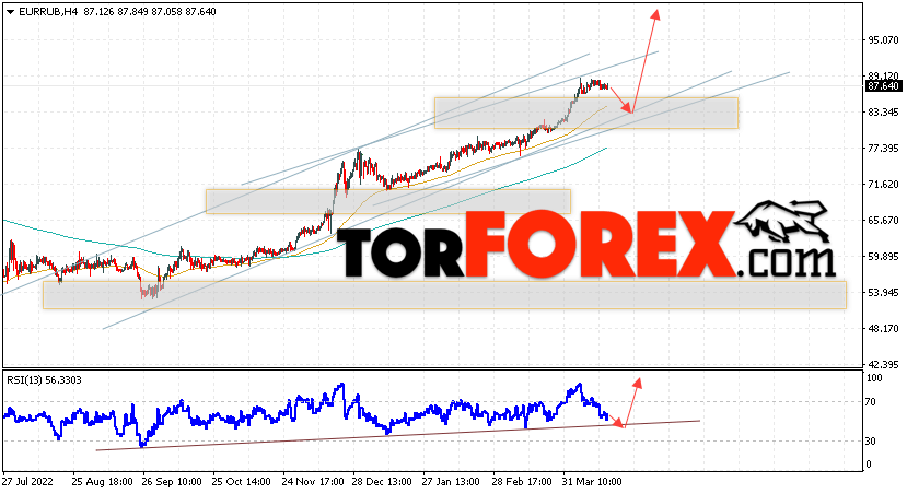 Дополнительным сигнальном в пользу подъёма валютной пары EUR/RUB на Форекс выступит тест линии линии поддержки на индикаторе относительной силы (RSI). Вторым сигналом станет отскок от нижней границы бычьего канала. Отменой варианта роста валютной пары EUR/RUB на Форекс 20 апреля 2023 станет падение и пробой уровня 78.05 Евро за Рубль. Это укажет на пробой области поддержки и продолжение снижения пары Евро Рубль в область ниже уровня 76.25. Подтверждением росту валютной пары выступит пробой области сопротивления и закрытие котировок инструмента выше уровня 92.05.