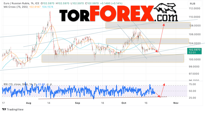 Дополнительным сигнальном в пользу роста валютной пары EUR/RUB на Форекс выступит тест линии линии поддержки на индикаторе относительной силы (RSI). Вторым сигналом станет отскок от нижней границы бычьего канала. Отменой варианта роста валютной пары EUR/RUB на Форекс 20 октября 2023 станет падение и пробой уровня 99.65 Евро за Рубль. Это укажет на пробой области поддержки и продолжение падения пары Евро Рубль в область ниже уровня 95.05. Подтверждением росту валютной пары выступит пробой области сопротивления и закрытие котировок инструмента выше уровня 103.65, что укажет на пробой верхней границы нисходящего канала.