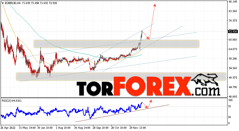 Дополнительным сигнальном в пользу подъёма валютной пары EUR/RUB на Форекс выступит тест линии линии поддержки на индикаторе относительной силы (RSI). Вторым сигналом станет отскок от верхней границы бычьего канала. Отменой варианта роста валютной пары EUR/RUB на Форекс 21 декабря 2022 станет падение и пробой уровня 64.15 Евро за Рубль. Это укажет на пробой области поддержки и продолжение снижения пары Евро Рубль в область ниже уровня 57.55. Подтверждением росту валютной пары выступит пробой области сопротивления и закрытие котировок инструмента выше уровня 74.95.