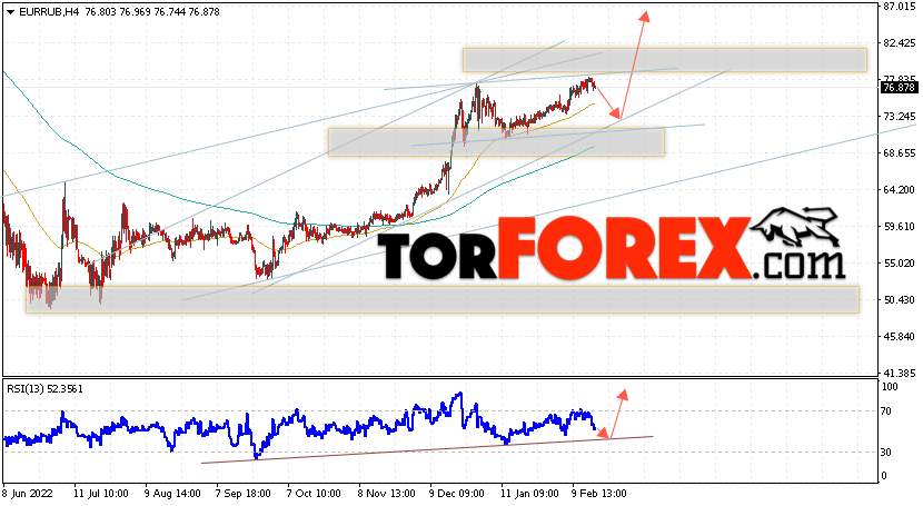 Дополнительным сигнальном в пользу подъёма валютной пары EUR/RUB на Форекс выступит тест линии линии поддержки на индикаторе относительной силы (RSI). Вторым сигналом станет отскок от нижней границы бычьего канала. Отменой варианта роста валютной пары EUR/RUB на Форекс 21 февраля 2023 станет падение и пробой уровня 69.05 Евро за Рубль. Это укажет на пробой области поддержки и продолжение снижения пары Евро Рубль в область ниже уровня 66.45. Подтверждением росту валютной пары выступит пробой области сопротивления и закрытие котировок инструмента выше уровня 82.05, что укажет на пробой верхней границы бычьего канала, а это сигнал к росту на ширину канала.