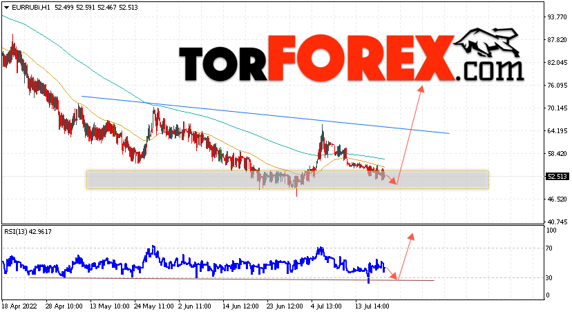 Дополнительным сигнальном в пользу роста валютной пары EUR/RUB на Форекс выступит тест линии линии поддержки на индикаторе относительной силы (RSI). Вторым сигналом станет отскок от нижней границы разворотной модели ”Голова и плечи”. Отменой варианта подъёма валютной пары EUR/RUB на Форекс 21 июля 2022 станет падение и пробой уровня 46.35 Евро за Рубль. Это укажет на пробой области поддержки и продолжение падения пары Евро Рубль в область ниже уровня 40.05. Подтверждением росту валютной пары выступит пробой области сопротивления и закрытие котировок инструмента выше уровня 67.05, что укажет на завершение формирования разворотной модели ”Голова и плечи” и начало отработки паттерна.