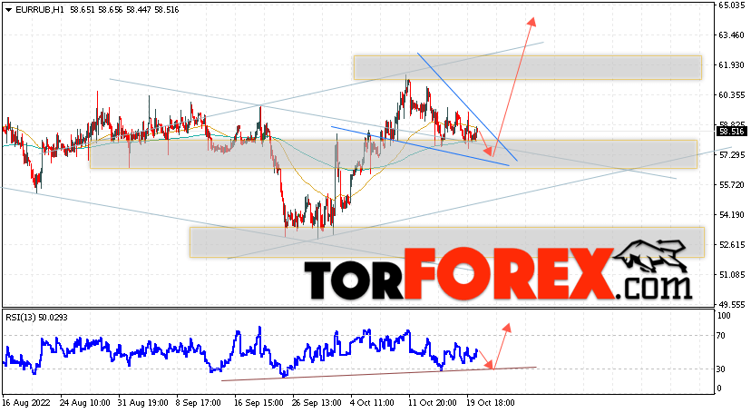 Дополнительным сигнальном в пользу подъёма валютной пары EUR/RUB на Форекс выступит тест линии линии поддержки на индикаторе относительной силы (RSI). Вторым сигналом станет отскок от нижней границы разворотной модели ”Клин”. Отменой варианта роста валютной пары EUR/RUB на Форекс 21 октября 2022 станет падение и пробой уровня 55.35 Евро за Рубль. Это укажет на пробой области поддержки и продолжение снижения пары Евро Рубль в область ниже уровня 52.65. Подтверждением росту валютной пары выступит пробой области сопротивления и закрытие котировок инструмента выше уровня 60.25, что укажет на пробой верхней границы модели ”Клин” и начало отработки паттерна с целями вверху.