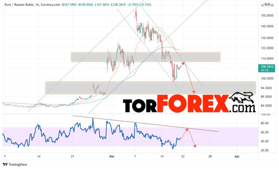 Дополнительным сигнальном в пользу падения валютной пары EUR/RUB на Форекс выступит тест линии сопротивления на индикаторе относительной силы (RSI). Вторым сигналом станет отскок от верхней границы нисходящего канала. Отменой варианта падения валютной пары EUR/RUB на Форекс 22 марта 2022 станет сильный рост и пробой уровня 121.55 Евро за Рубль. Это укажет на пробой области сопротивления и продолжение роста пары Евро Рубль в область выше уровня 130.05. Подтверждением падению валютной пары выступит пробой области поддержки и закрытие котировок инструмента под уровнем 100.05.