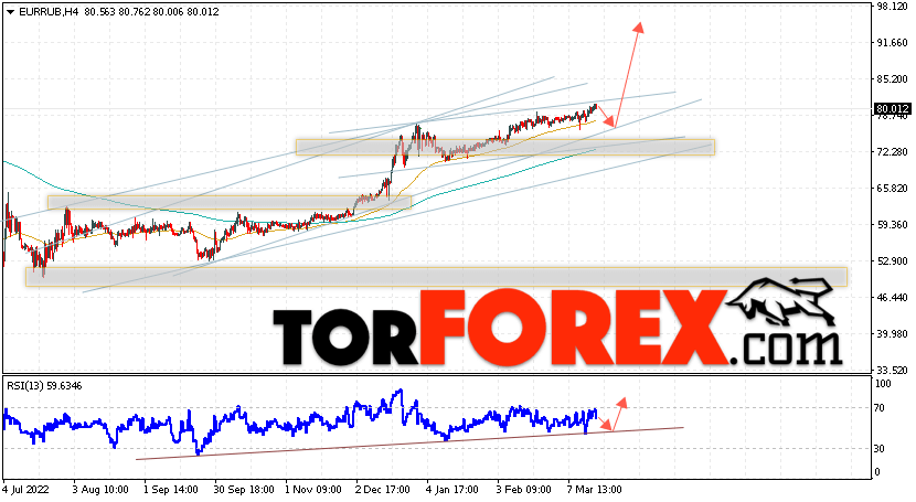 Дополнительным сигнальном в пользу подъёма валютной пары EUR/RUB на Форекс выступит тест линии линии поддержки на индикаторе относительной силы (RSI). Вторым сигналом станет отскок от нижней границы бычьего канала. Отменой варианта роста валютной пары EUR/RUB на Форекс 22 марта 2023 станет падение и пробой уровня 72.55 Евро за Рубль. Это укажет на пробой области поддержки и продолжение снижения пары Евро Рубль в область ниже уровня 67.65. Подтверждением росту валютной пары выступит пробой области сопротивления и закрытие котировок инструмента выше уровня 82.65, что укажет на пробой верхней границы бычьего канала, а это сигнал к росту на ширину канала.