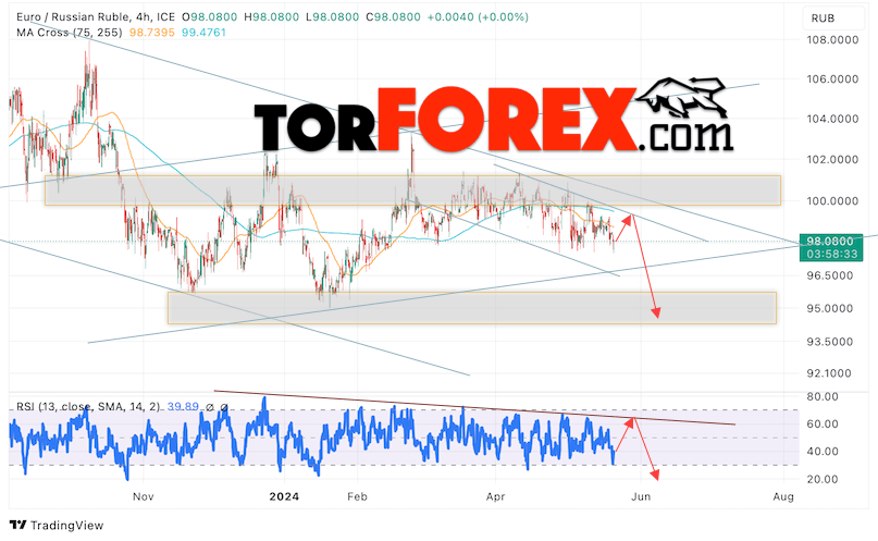 Дополнительным сигнальном в пользу снижения валютной пары EUR/RUB на Форекс выступит тест линии линии сопротивления на индикаторе относительной силы (RSI). Вторым сигналом станет отскок от верхней границы медвежьего канала. Отменой варианта снижения валютной пары EUR/RUB на Форекс 22 мая 2024 станет сильный рост и пробой уровня 101.65 Евро за Рубль. Это укажет на пробой области сопротивления и продолжение роста пары Евро Рубль в область выше уровня 109.05. Подтверждением падению валютной пары выступит пробой области поддержки и закрытие котировок инструмента ниже уровня 95.05, что укажет на пробой нижней границы бычьего канала коррекции.