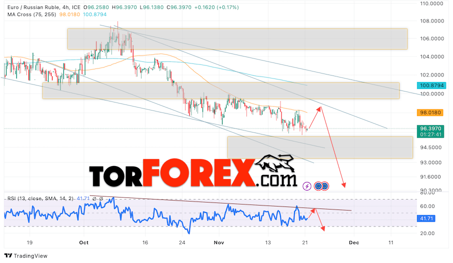 Дополнительным сигнальном в пользу падения валютной пары EUR/RUB на Форекс выступит тест линии линии сопротивления на индикаторе относительной силы (RSI). Вторым сигналом станет отскок от верхней границы нисходящего канала. Отменой варианта падения валютной пары EUR/RUB на Форекс 22 ноября 2023 станет сильный рост и пробой уровня 99.75 Евро за Рубль. Это укажет на пробой области сопротивления и продолжение роста пары Евро Рубль в область выше уровня 103.65. Подтверждением падению валютной пары выступит пробой области поддержки и закрытие котировок инструмента ниже уровня 94.05.