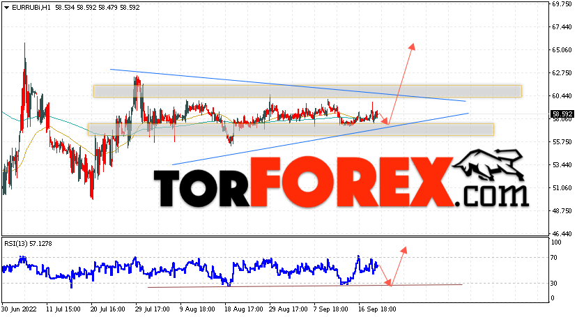 Дополнительным сигнальном в пользу роста валютной пары EUR/RUB на Форекс выступит тест линии линии поддержки на индикаторе относительной силы (RSI). Вторым сигналом станет отскок от нижней границы модели ”Треугольник”. Отменой варианта подъёма валютной пары EUR/RUB на Форекс 22 сентября 2022 станет падение и пробой уровня 53.45 Евро за Рубль. Это укажет на пробой области поддержки и продолжение падения пары Евро Рубль в область ниже уровня 48.35. Подтверждением росту валютной пары выступит пробой области сопротивления и закрытие котировок инструмента выше уровня 62.65, что укажет на пробой верхней границы модели ”Треугольник” и начало отработки паттерна.