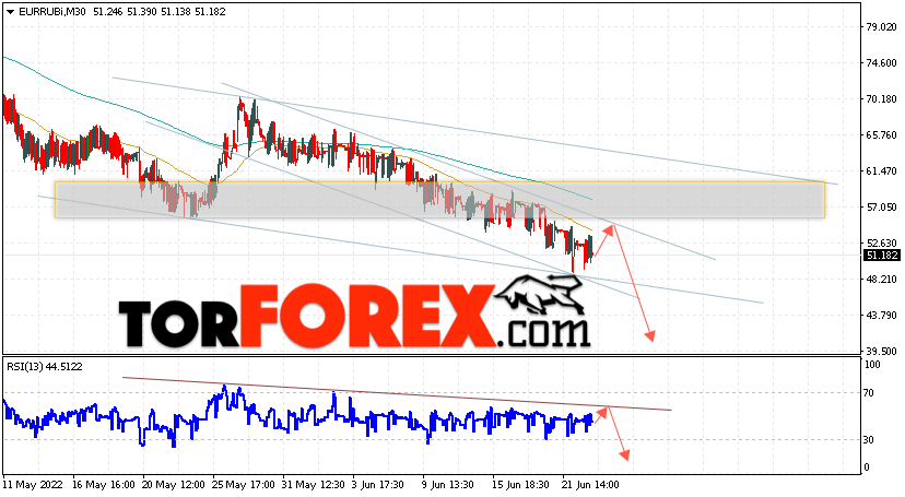 Дополнительным сигнальном в пользу падения валютной пары EUR/RUB на Форекс выступит тест линии линии сопротивления на индикаторе относительной силы (RSI). Вторым сигналом станет отскок от верхней границы медвежьего канала. Отменой варианта падения валютной пары EUR/RUB на Форекс 23 июня 2022 станет сильный рост и пробой уровня 62.05 Евро за Рубль. Это укажет на пробой области сопротивления и продолжение подъёма пары Евро Рубль в область выше уровня 67.65. Подтверждением падению валютной пары выступит пробой области поддержки и закрытие котировок инструмента ниже уровня 46.05, что укажет на пробой нижней границы нисходящего канала.