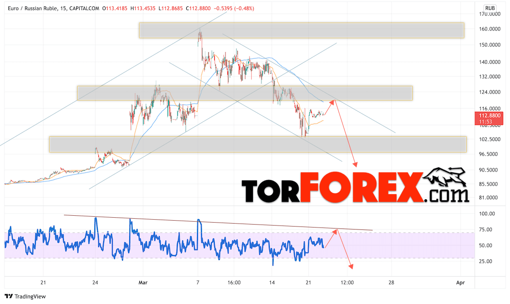 Дополнительным сигнальном в пользу падения валютной пары EUR/RUB на Форекс выступит тест линии сопротивления на индикаторе относительной силы (RSI). Вторым сигналом станет отскок от верхней границы нисходящего канала. Отменой варианта падения валютной пары EUR/RUB на Форекс 23 марта 2022 станет сильный рост и пробой уровня 127.05 Евро за Рубль. Это укажет на пробой области сопротивления и продолжение роста пары Евро Рубль в область выше уровня 135.05. Подтверждением падению валютной пары выступит пробой области поддержки и закрытие котировок инструмента под уровнем 102.55.