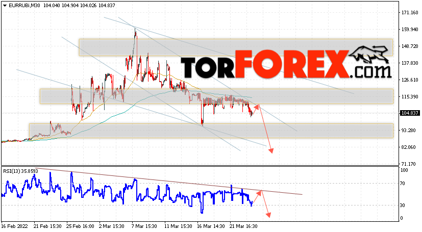Дополнительным сигнальном в пользу падения валютной пары EUR/RUB на Форекс выступит тест линии сопротивления на индикаторе относительной силы (RSI). Вторым сигналом станет отскок от верхней границы нисходящего канала. Отменой варианта падения валютной пары EUR/RUB на Форекс 24 марта 2022 станет сильный рост и пробой уровня 120.05 Евро за Рубль. Это укажет на пробой области сопротивления и продолжение роста пары Евро Рубль в область выше уровня 130.05. Подтверждением падению валютной пары выступит пробой области поддержки и закрытие котировок инструмента под уровнем 93.05.
