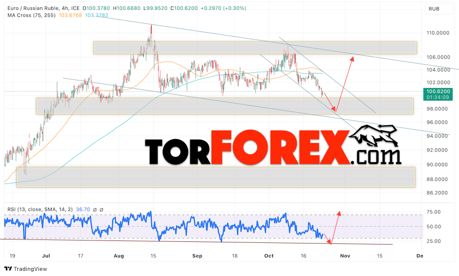 Дополнительным сигнальном в пользу роста валютной пары EUR/RUB на Форекс выступит тест линии линии поддержки на индикаторе относительной силы (RSI). Вторым сигналом станет отскок от нижней границы медвежьего канала. Отменой варианта роста валютной пары EUR/RUB на Форекс 24 октября 2023 станет падение и пробой уровня 94.05 Евро за Рубль. Это укажет на пробой области поддержки и продолжение падения пары Евро Рубль в область ниже уровня 91.45. Подтверждением росту валютной пары выступит пробой области сопротивления и закрытие котировок инструмента выше уровня 102.55, что укажет на пробой верхней границы нисходящего канала.