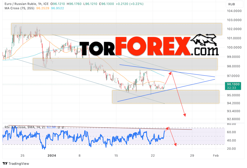 Дополнительным сигнальном в пользу падения валютной пары EUR/RUB на Форекс выступит тест линии линии сопротивления на индикаторе относительной силы (RSI). Вторым сигналом станет отскок от нижней границы бычьего канала. Отменой варианта падения валютной пары EUR/RUB на Форекс 24 января 2024 станет сильный рост и пробой уровня 98.65 Евро за Рубль. Это укажет на пробой области сопротивления и продолжение роста пары Евро Рубль в область выше уровня 103.55. Подтверждением падению валютной пары выступит пробой области поддержки и закрытие котировок инструмента ниже уровня 94.65, что укажет на пробой нижней границы модели «Треугольник» и начало отработки паттерна с целью внизу.