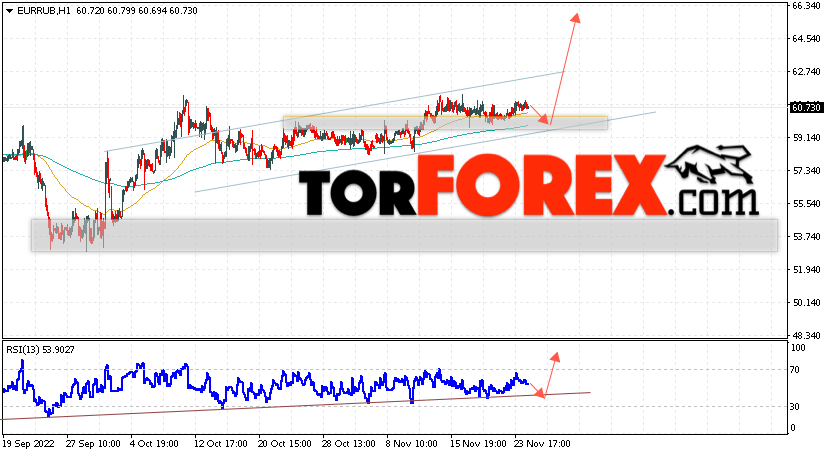 Дополнительным сигнальном в пользу подъёма валютной пары EUR/RUB на Форекс выступит тест линии линии поддержки на индикаторе относительной силы (RSI). Вторым сигналом станет отскок от нижней границы бычьего канала. Отменой варианта роста валютной пары EUR/RUB на Форекс 25 ноября 2022 станет падение и пробой уровня 57.65 Евро за Рубль. Это укажет на пробой области поддержки и продолжение снижения пары Евро Рубль в область ниже уровня 53.75. Подтверждением росту валютной пары выступит пробой области сопротивления и закрытие котировок инструмента выше уровня 63.05, что укажет на пробой верхней границы бычьего канала, а это сигнал к росту.